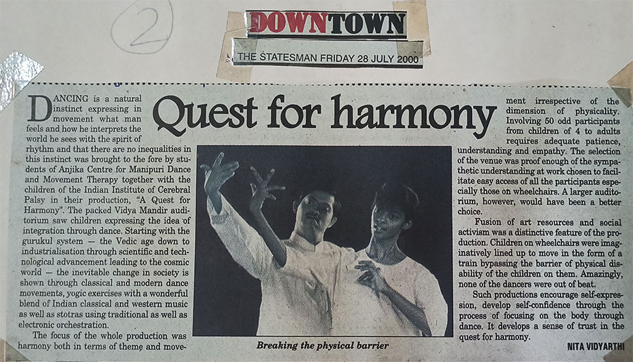 Anjika Centre for Manipuri Dance and Movement Therapy and Indian Institute of Cerebral Palsy will stage A Quest for Harmony at 6.30 pm at Vidya Mandir on 24 June. Normal children will perform with mentally challenged kids to send out the message that the latter can do much more than what is commonly perceived.