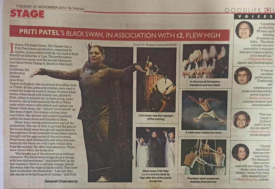 “Priti Patel’s Black Swan....flew high. ...Ishano, The Black Swan, The Chosen One, a Priti Patel dance production, organized by Anjika…was based on Manipuri dance traditions. … Music was a strong and evocative part of the production. Flutes, drums, pena and cymbals were used to create the magical world of Swans.” Visit Link