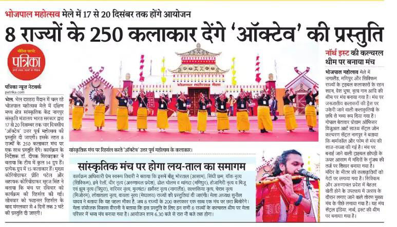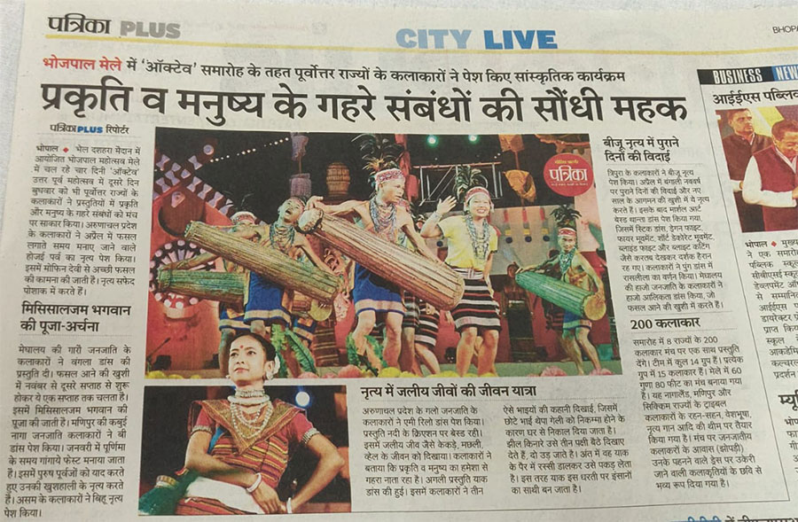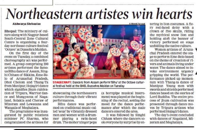 Pungcholom, Dholcholom, Rasleela, and the dynamic martial art form, Thang-Ta of Manipur, The colourful dances of Warrior dance and Harvest dance of Nagaland, the celebration of Spring through Bihu dances and Bhortal dance of Assam, Yak Dance of Sikkim, Eme-Relo dance and Deer dance of Arunachal Pradesh, Sawlakia dance and Cheraw dance of Mizoram, Wangala dance of Meghalaya, Bizu dance of Tripura, The total number of artists is two hundreds weave these beautiful dances together directed by Priti Patel.